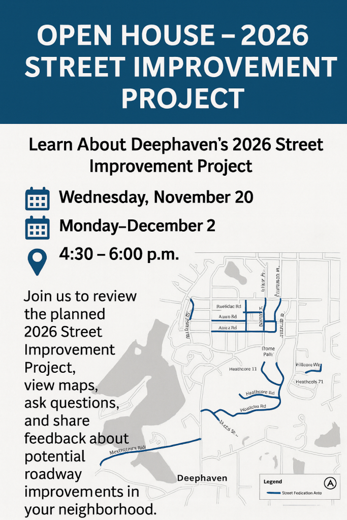 The City of Deephaven invites residents to attend one of two upcoming open houses to learn more about the 2026 Street Improvement Project. City Staff and the City Engineer will be available to review the project area, answer questions, and gather feedback from residents.